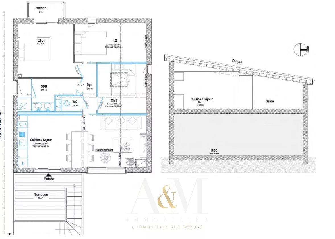 un balcon côté Ouest, une terrasse en bois côté Est ainsi qu’un accès privatif par escalier extérieur côté Est.